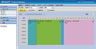 コンテンツ作成・編集ツール「Designer」、コンテンツ配送・管理ツール「Content Manager」、表示ツール「Player」で構成されるSCALAのデジタルサイネージ・ソリューション「Scala」シリーズは、世界65か国、50万台以上の画面で活躍している。日本語を含む9か国語に対応。コンテンツ作成は、JavaScriptやVBScriptなどの外部システムとの連携が可能。それぞれのディスプレイの解像度・アスペクトに縛られず、複数動画の同時再生やフルHD動画の再生ができる。