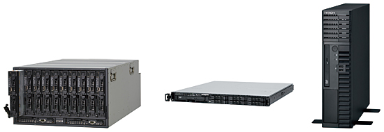 タワー、ラック、ブレードで豊富なラインアップをもつ。写真は左からブレードサーバ「BS320」、ラックサーバ「HA8000/RS110」、横幅93mmで約10kgのスリムモデル「HA8000/SS10」