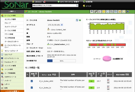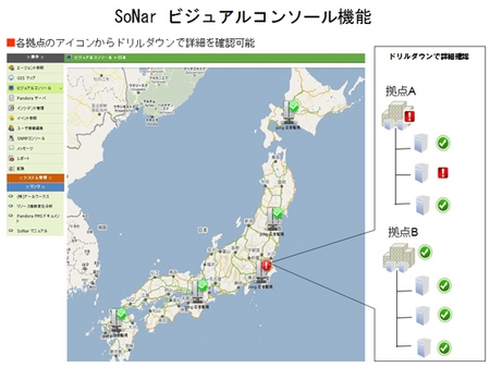 「SoNar」の特徴として、まず挙げられるのが「監視対象の自動検知・設定」だ。これは、監視対象が更新・増加した際に、あらかじめ指定しておいたネットワークセグメントのノードを自動検知し、設定を自動で行う機能。設定は物理環境だけでなく、仮想環境にも適応する。監視対象に搭載するエージェントがサーバー側にプッシュ型で通信し、仮想マシンを立ち上げた際にも自動で情報を収集してくれる。地図やデータセンタのラック構成図上にシステムの状態を重ね合わせて表示させる「ビジュアルコンソール」機能や、移動する監視対象(携帯電話など)の位置を動的にマップ上に表現する「GISマップ」機能など、グラフィカルにシステムの状態を表示させる便利な機能も備わっている。