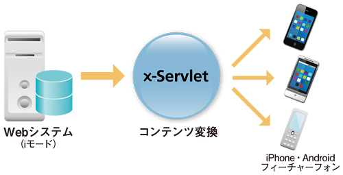 一方の「x-Servlet」は、アクセスしてきた機種を自動識別し、携帯電話やスマホなど、各端末に最適なコンテンツを配信することができる。ワンソースでマルチキャリアに対応できるだけではなく、年間100機種以上発売されるスマホ、ガラケーの新機種にも日々自動的に対応できる。