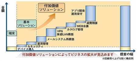 端末の販売に加え、利用するうえで必要なメールセキュリティや運用管理、モバイルデバイス管理(MDM)、VPNなどのサービスなども取り扱っており、この分野への新サービス参入もますます盛んになっていく。「一度、顧客に端末を導入すれば、こうしたソリューションサービスをプラスしていくことで、さらに収益を上げられる」(溝口常務)。競合他社に比べて、モバイル端末を使ったクラウド・サービス提供で先行する同社と連携し、先進のソリューション提供を行うことで販売店の次世代ビジネスを築くことができるのだ。