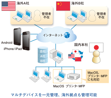 クオリティソフトが提供するISM CloudOneは、「多様化するIT資産」、「ビジネスのグローバル化/勤務形態の変化」といった企業を取り巻く環境の変化に対応し、海外にある端末も含めたマルチデバイスのセキュリティ維持・管理を行うことが可能。従来のPC(Windows)、スマートデバイス(Android、iPhone/iPad)に加えて、MacOS、プリンタ・MFP(複合機)などのマルチデバイスに対応し、企業におけるIT機器の一元管理をさらに進める予定だ。セキュリティ対策も拠点ごとに異なるセキュリティポリシ(OSのパッチやウィルス対策ソフトのバージョンや最新パターンファイルなど)のあるべき姿を日次で辞書提供しており、ノンオペレーションでセキュリティの維持・管理を行う。また、PC管理業務に有効な、リモートコントロール機能やソフトウェア配布、起動制御機能も標準機能として搭載。さらにクライアント環境も管理者環境も日・中・英の3か国語に対応しており、海外拠点を含めた一元的なIT資産の管理を実現する。