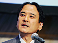 | 販売パートナーの関係者を前に挨拶をするEMCジャパンの山野修社長 |