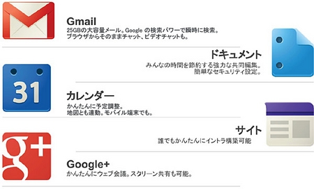 「Google Apps for Business」は、25GBの容量をもつウェブベースの「メール」「カレンダー」「ドキュメント」「Web会議」など、ビジネスで生産性を向上するために不可欠な機能を搭載している。1ユーザーあたり年間6000円で利用できるという低コストも魅力だ。すでに世界で約500万社、8000万ユーザーが利用し、国内でもこの1年でユーザー数が50%増加している。中小企業から大企業まで、業種や規模を問わず利用されていて、最近では、損保ジャパングループが国内で最大規模となる3万ユーザーの利用を決めている。