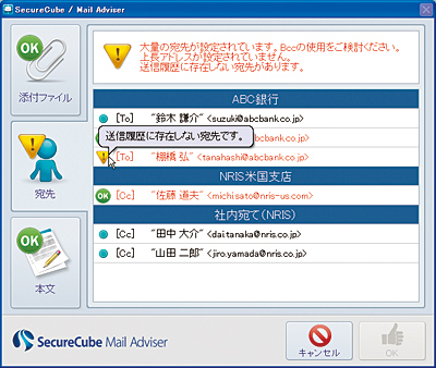 「SecureCube / Mail Adviser」は、うっかりミスによるメール誤送信を視覚的に気づかせるツールである。メール誤送信のあらゆるパターンに沿って、わかりやすいデザインの確認画面を表示し、メールを送る前に送信者自身による再確認を促す。大手システムインテグレータ(SIer)のTISが「SecureCube / Mail Adviser」を採用し、メールの誤送信をほぼゼロにするなど、「SecureCube / Mail Adviser」の活用事例は増えつつある。