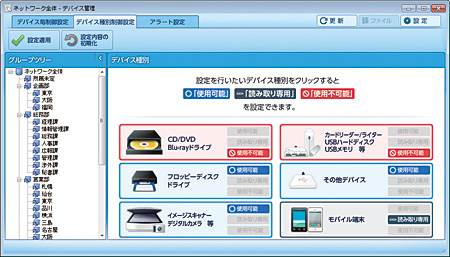 Skyは、1年にほぼ1回の頻度で「SKY SEA Client View」をメジャーバージョンアップし、最新のOS環境をいち早くサポートすることをポリシーとしている。Windowsだけでなく、ユーザーのさまざまな環境で利用することができるように、前版ではユーザー企業・団体で利用が増えてきたMac OSもサポートした。異なるバージョンのWindowsとMac OS搭載端末が混在する企業・団体でも、「SKYSEA Client View」ならば難なく使うことができる。このマルチOSのサポートで、威力を発揮するのが「デバイス管理」だ。デバイス管理とは、USBメモリやDVD/Blu-rayディスク、スキャナやデジタルカメラといったパソコンの周辺機器の利用を制御すること。禁止するだけでなく、利用を許可する機器を限定したり、「データの読み込みは許可、書き込みは禁止」といったかたちで、操作項目を制限したりすることもできる。機密情報の漏えいを防ぎ、不正プログラムが外部から侵入するのを防止するのに、効果を発揮する。とくに、機密情報がUSBメモリから漏れるケースが増えており、ユーザー企業にとってUSBメモリの利用制限は重要度が増している。