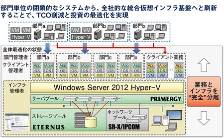 「当社が提案する統合仮想インフラは、部門単位で閉じた状態にあった従来のITシステムを、業務とインフラに分割し、インフラをサーバーとストレージに切り分けることによって、運用効率と投資対効果を大幅に向上させる。『Windows Server 2012』は、この統合仮想インフラに最適なOSだ」と葛西氏は続けた。