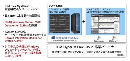 IBM Hyper-V Flex Cloudは、仮想環境をスムーズに構築し、簡単に運用管理できる仮想化ソリューションで、IBM Flex Systemと「Windows Server 2012 Datacenter Edition IBM版」、マイクロソフトのシステム運用管理ソフト「System Center 2012」「System Center 2012」にハードウェアの監視機能を統合する「IBM Upward Integration Module」を組み合わせている。