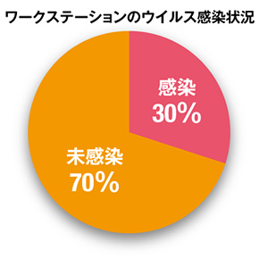 その上で、ウイルス感染状況を調べると、30%のワークステーションがウイルスに感染という結果でした(図1)。これらの数字が何を示しているかは、言うまでもないでしょう。