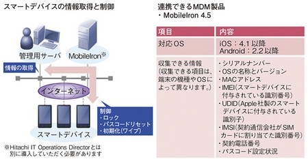 このところスマートデバイスの業務利用が急増していることから、「Hitachi IT Operations Director」は、MDM製品「MobileIron」との連携を実現した。これによって、統合された一つの画面上で、PCからスマートフォンまで、ネットワーク上のさまざまな端末を管理できるようになった。MDM製品「MobileIron」は、業界標準の各種機能に加え、高い柔軟性を備えていることで評価の高い製品である。