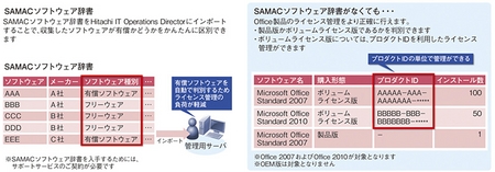 さらに、今回のバージョンでの新機能として、ライセンス管理業務で管理者の助けになる「SAMACソフトウェア辞書(※)」にも対応。SAMACソフトウェア辞書を「Hitachi IT Operations Director」へインポートすることで、ソフトウェアが有償かどうかを自動で判別できるため、ライセンス管理の業務負荷を大きく低減できる。プロダクトIDでの管理も可能なため、より一層厳格な管理が可能となる。