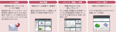 ログイン後に表示されるホーム画面では最新状態をチェックすることができる。ウェブブラウザで表示できるので、ノートPCや出張先の拠点のPCでも作業が可能だ。問題の箇所を発見したら、ドリルダウンで詳細をチェック。具体的な対策の検討をすぐに始められるので心強い。