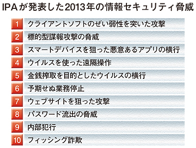経済産業省の外郭団体で、不正アクセス・ウイルスのトレンドと対策方法を調査・研究する独立行政法人の情報処理推進機構(IPA)は、2013年3月、今年顕在化すると見込む10個の脅威を発表したが、そのなかに「標的型謀報攻撃の脅威」を盛り込んだ。IPAでは「2011年、2012年に引き続き、政府機関など特定の企業・団体を狙った攻撃は、2013年も増えるだろう」と予測しており、注意を促している。