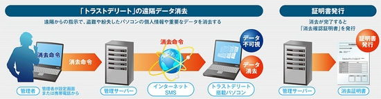 「トラストデリート」は、セキュリティポリシーのレベルに応じて3段階の製品を用意している。ハイエンドレベルでは、携帯電話網のショートメッセージ(SMS)を利用し、電源が入っていないパソコンを起動させてデータの消去ができる。この技術はパナソニック社の「Let's note」で採用しているものだ。また、社内で紛失してしまい、見つかるかもしれない場合に活用できる起動ロック機能をインテル アンチセフト・テクノロジーを用いて実現している。さらに、特別なハードウェア技術が搭載されていなくても、ソフトウェアのみで遠隔からデータ消去できるラインナップをそろえており、盗難・紛失時の情報漏えい対策に死角がない。現在のユーザーは、情報資産を大切にする企業が中心で、グローバルで展開する企業も多い。絶対に情報漏えいを許さないという姿勢が、「トラストデリート」を選ばせている。また、遠隔データ消去ができるということで、管理・運用面の時間やコストも削減できる。