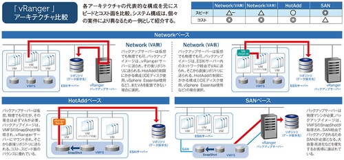 さらにリセラーとユーザー企業にとってメリットとなるのが、導入時にあらゆるVMware環境に対応するアーキテクチャの柔軟性だ。企業規模を問わず、既存のネットワーク環境をベースに、仮想環境を構築するケースが多い。導入時に優先すべきはコストかスピードかは、ユーザーの状況によって異なるだろう。例として中小企業でも導入しやすい「Networkベース」と「HotAddベース」、膨大なデータのバックアップが必要になる中堅以上の企業向けの「SANベース」、3つのケースを比較してみよう。