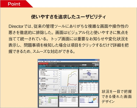 「Hitachi IT Operations Director(Director)」は、日立製作所が蓄積してきたITの統合運用やユーザーインターフェースのノウハウを結集した製品だ。Directorはパソコンやスマートフォン、タブレット端末などのハードウェアだけでなく、インストールされているソフトウェアを整理してライセンスの利用状況まで包括的に一元管理する。パソコンのOSやメモリ、ハードディスク(HDD)容量などのスペック情報はもちろん、その機器を管理・利用している部署や担当者の情報とも紐づけて管理することもできる。