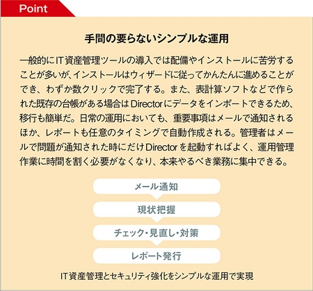 Windowsやセキュリティ製品の更新状況を監視、リスクのある端末を見つけ出す 今後、ますます成長していくであろうIT資産管理市場において、DirectorはIT資産管理とセキュリティ管理を1パッケージで実現し、運用管理者の負担を軽減しながら確実に資産を管理できるお勧めツールである。