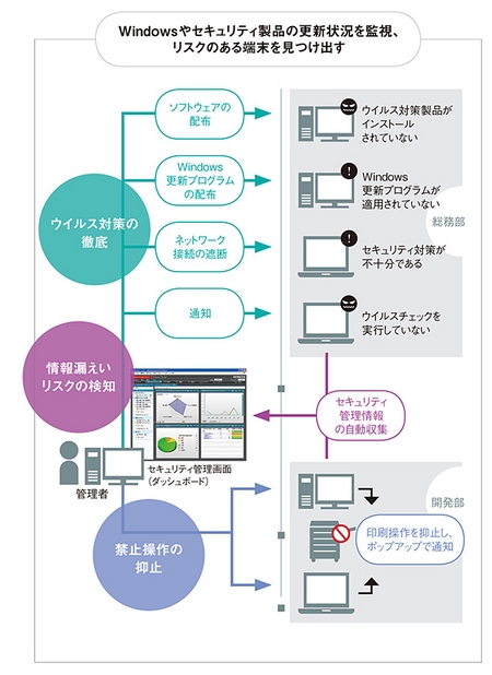 PCやモバイル端末、周辺機器まで全社のIT資産を一元的に管理できる監視機能で利便性を損なわずに情報漏えいを抑止する