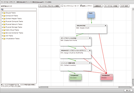 シスコシステムズの「Cisco UCS Director」は、物理・仮想環境が混在するインフラ基盤を自動的に管理するオーケストレーションツールだ。このツールを導入すれば、単一の管理コンソールを利用して、サーバー、ネットワーク、ストレージ、仮想マシンを統合的に管理することができる。なかでも特徴的なのが、運用フローを定型・自動化する機能だ。「Cisco UCS Director」には、「タスク」と呼ばれる管理対象への作業項目が550以上も標準で用意されており、このタスクを必要となる運用フローに合わせて並べていくだけで、運用フローに基づいた自動化処理を簡単に作成することができる。