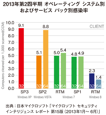 調査会社のIDC Japanが2013年10月に発表したレポートによれば、今年6月末時点での国内法人向けパソコンの稼働台数は3545万台で、そのうち30.5%の1080万台でWindows XPが稼働しているという。Windows XPは、日本マイクロソフトが再三にわたって告知しているように、来年4月8日(米国時間)にサポート終了を迎える。サポート終了まで残り1年を切った時点でも、なんと3割強のパソコンでWindows XPが稼働しているのだ。このレポートでは、パソコンの買い替えによってWindows XPからの移行が急ピッチで進み、サポート終了後の来年6月末に全体の10.3%、371万台まで減少すると予測している。だが、見方を変えれば、企業で利用されるパソコンの約1割ものマシンで、サポート切れのOSが稼働し続けるのである。これは、実に恐るべき事態といえる。 サポート終了を迎えるWindows XPからの移行は、なぜ必要なのか。それは、セキュリティ上の脅威に対して無防備になることが、最大の理由だ。Windows XPのサポートが終了すると、それ以降は、たとえ深刻なぜい弱性が発見されたとしても、修正のためのアップデートは提供されない。ただ、なかには「サポート終了後もWindows XPが1割も残るのだから慌てる必要はない」「これまでも被害に遭ったことがないので、多少のぜい弱性など気にならない」「わが社には盗まれて困る機密情報はない」と考えるユーザー企業も少なくないだろう。しかし、高をくくってはいけない。攻撃者は、マイクロソフトが公開したぜい弱性を解析し、ぜい弱性を修正していないパソコンを狙って攻撃を仕掛けることが多い。そのぜい弱性だが、昨年7月から今年7月までの1年間に日本マイクロソフトが公表したWindows XPに関連するものは45件にも上っている。