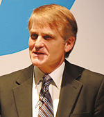 米HPのブラッド・フリーマン氏 また、記者発表会では、米HPでインクジェットプリンタのハードウェアプラットフォーム開発の責任者を務めるブラッド・フリーマン氏が来日して、「HP Officejet Pro X シリーズ」のデモを交えながら、製品のメリットをアピールした。フリーマン氏は、「HPのインクジェットプリントモジュールは18か月ごとに2倍のパフォーマンスになっている」と、優れた開発力を訴えていた。