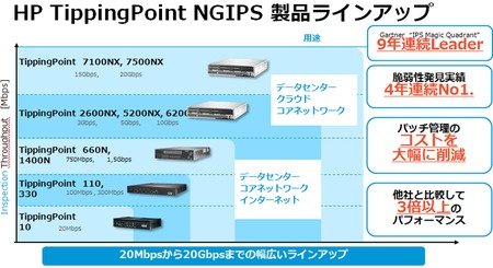 HPの次世代IPS「TippingPoint NGIPS」は、ネットワークに出入り口に配置して、不正アクセスやウイルスの拡散、情報の漏洩などを防止するソリューション。「次世代」と冠がつくだけの従来製品以上の機能とパフォーマンスを備える。