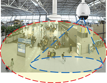 また、「パノラミックPTZ機能」は、フィッシュアイ型の360°パノラマビューのカメラとスピードドーム型のカメラを連動させ、全体を俯瞰監視しながら、特定の対象物をすばやくズームアップする。イベント会場や公共スペースなど広範なエリアを監視し、必要な際に特定場所や人物をクローズアップするというニーズに対応することができる。