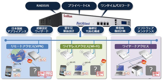 「NetAttest EPS」は、ネットワーク認証に必要なRADIUSサーバー機能、デジタル証明書を発行・管理するプライベートCA機能、ワンタイムパスワード認証機能など、ネットワーク認証に必要な機能のすべてを備えている。これによって、有線・無線を問わず、安全なネットワーク認証基盤の構築をサポートする。