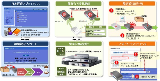 導入後の運用では、まず、ハードディスクレスなので、故障が少ない。さらに、設定情報を1ファイルに集約してFTPサーバーへ自動でバックアップするので、障害時にはバックアップした設定情報を代替機にリストアするだけでいい。これによって、最短10分での復帰を実現する。冗長化構成だけでなく分散構成(親子連携)にも対応し、複数拠点に展開したNetAttest EPSの登録ユーザーの一元管理と「NetAttest EPS」親子間での認証連携が実現する。