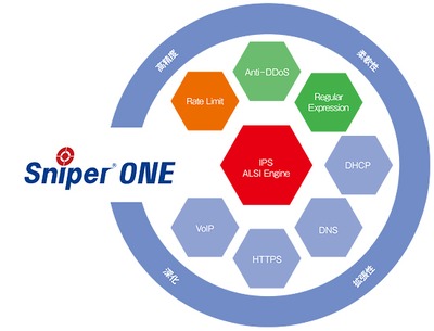 IPSは、主力製品のSecureSoft Sniper IPSがベース。搭載する七つの機能は、「DNS」「VoIP」「DHCP」「HTTPS」「Regular Expression」「Anti-DDoS」「Rate Limit」だ。IPSとともに、「Anti-DDoS」も、主力製品のSecureSoft Sniper DDXがベースになっている。つまり、SecureSoft Sniper ONEは従来の主力製品をはじめ、ネットワークセキュリティに求められるすべての機能を備えた統合製品なのだ。