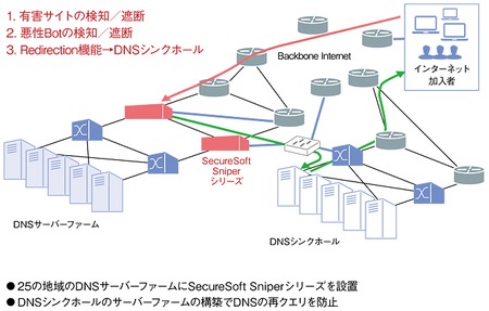 大手ISPは25地域のDNSサーバーファームに「Secure Soft Sniper」シリーズを設置し、DNS通信を使ったDDoS攻撃対策を講じている。DNSシンクホールのサーバーファームを構築したことによって、DNSの再クエリを防止しているのがポイントだ。