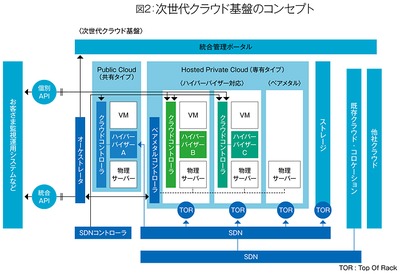 ── 昨年秋、次世代クラウド基盤の開発計画を明らかにされましたが、どのようなことを実現しようとされているのですか。 田中 次世代クラウド基盤のコンセプトは、複数のタイプのサーバーを一つのクラウドサービスとして、オンデマンドで柔軟に、かつ一体的に利用できる環境ということです。それによって何が実現できるかというと、一つの基盤において共有タイプのパブリッククラウドと専有タイプのプライベートクラウドを提供し、異なる仮想化環境やベアメタルのような物理サーバーも利用できるようにすることによって、お客様のオンプレミスのサーバー環境をそのままクラウド化できるようにするというのが勘所です(図2参照)。