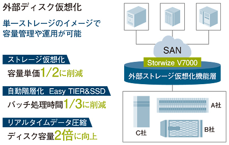 機能面では、エンタープライズクラスのストレージ「IBM Storwize V7000(V7000)」で搭載されているVMwareのストレージ機能「VAAI」を標準でサポート。この機能によって、VAAIに未対応の古い外部ストレージをストレージ仮想化製品「IBM System Storage SANボリューム・コントローラー(SVC)」の配下でVAAI対応の仮想専用ストレージとして再利用できる。