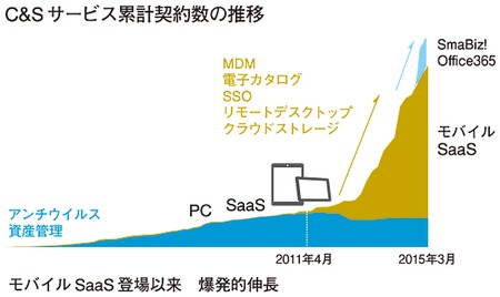 モバイルを生かすうえで、欠かせないのがクラウドサービス。ユーザーにとっても、初期投資を抑制でき、利用者単位の定額課金であるため使い勝手がいい。ソフトバンクC&Sが提供するモバイルSaaSのサービス契約でも、デバイス管理(MDM)をデフォルトとして、電子カタログなどのドキュメント系アプリを加えたり、Office 365を加えるといったケースが多いという。とくに、ドキュメント系アプリは営業にとって必須で、業種と関係なく高いニーズがある。