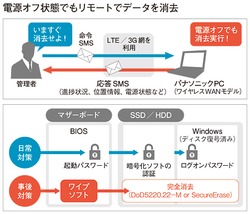 ──レッツノートに搭載した遠隔データ消去ソリューションの優位性について教えてください。坂本 一般的なリモートワイプは、紛失・盗難のためというよりも、PCをリセットするためのものです。それもインターネットにつながっていないとリモートワイプの命令を出せない。レッツノートの場合は、通信キャリアのSMSを使用するため、インターネット接続を必要としません。また、SMSを使用しないLAN環境用モデルでも、GPSやWindows 8以降の機能で得られる位置情報を使って、設定したエリアの外に出たらロックやデータ消去を自動的に実行するということができます。