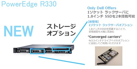 ユーザーニーズを組み入れた同社独自の構成としては、ラック型のR330に搭載した2つのストレージ機能に注目したい。1つは、最大2台の1.8インチSSDドライブを挿入できる機能を新たに搭載し、システムの起動/再起動時間を短縮した。もう1つは、最大4台のケーブル接続/ホットプラグ対応の内蔵3.5インチHDDと最大8台のホットプラグ対応の2.5インチHDDにより、データ増大に対応した。いずれの機能も、同等クラスの競合他社サーバーにはなく、デル製品だけに搭載されているユーザービリティを追求したものだ。