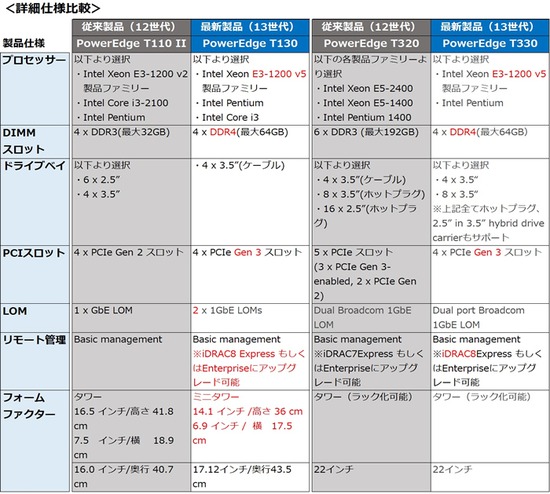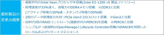 新モデル4機種は、いずれも最新世代インテルXeonプロセッサE3-1200 v5製品ファミリーを搭載し、メモリがDDR3からDDR4にパワーアップしたことなどで、将来的な拡張の余地を確保しアプリを高速化できる。また、メモリのパフォーマンスが大幅に向上し、4つのDIMMスロットとDDR4メモリで最大64GBのスルー時間を実現した。これにより、旧世代のDDR3に比べデータ転送速度が33%高速化した。さらには、PowerEdgeサーバーの組み込み型サーバー管理ソリューション「iDRAC8」を利用したリモートマネジメントが可能で、シンプルで直感的な運用管理ができる。