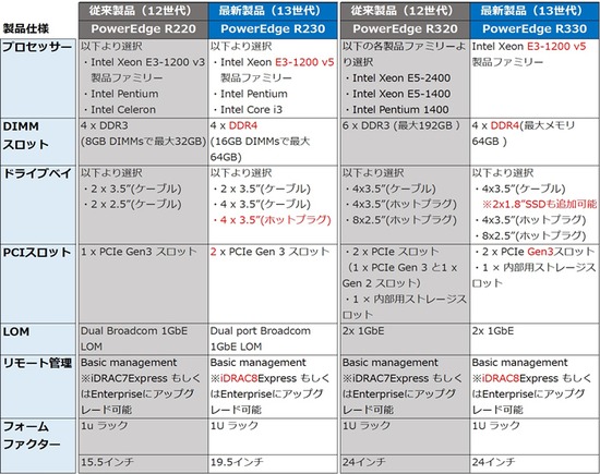 左からラックマウント型のR230(左上)、R330(左下)とタワー型のT130、T330