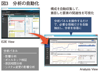「分析」では、万が一、障害が発生した際に、原因特定の分析に必要な情報を自動で抽出し可視化する(図3)。分析には「ボトルネック状況の確認」など多角的な分析軸が用意されており、原因を特定する分析作業が容易になる。