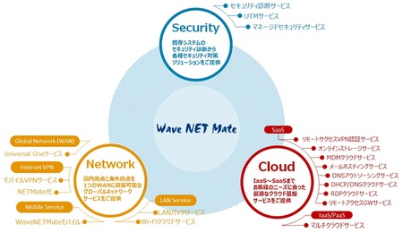WaveNETMateは、企業ネットワーク(WAN/LAN)、クラウドサービス、セキュリティサービスの三つをワンストップで提供する総合ネットワークサービス。今回の出展では、これら三つのサービスに追加された新機能を中心に紹介した。企業ネットワークは、グローバル(国内/海外)WAN、インターネットVPN、モバイル通信、LANサービスの4サービスをラインアップする。今回、グローバル(国内/海外)WANに「クラウドコネクト for AWS」と「クラウドコネクト for Azure」が加わった。これにより、インターネットを経由せず、閉域網で安全にWANとAWSやAzureとダイレクト接続が可能になる。