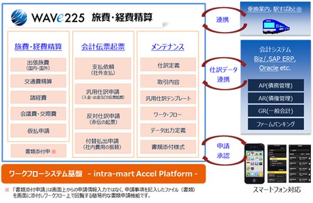 「WAVE225」が採用するintra-mart Accel Platformは、4000社以上が導入しているシステム基盤だ。旅費・経費精算、稟議だけでなく、他のワークフロー業務を必要に応じて追加していくことができる拡張性の高さも大きな魅力だ。