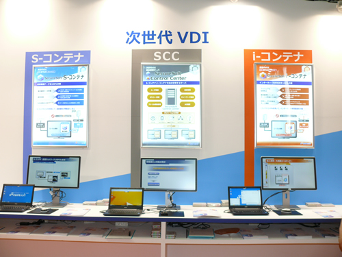 展示の一番の目玉は、3月に発売した新製品で独自のコンテナ技術を搭載した情報漏えい防止ソリューションのSecureSoftコンテナだ。コンテナ技術は、1台のWindows PC上にコンテナ環境を生成して、メモリ、ファイル、ネットワークの各リソースをローカル環境と分離するもの。重要業務データを分離する「SecureSoft S-コンテナ」と、インターネット利用環境を隔離する「SecureSoft i-コンテナ」をラインアップする。