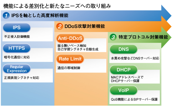 製品の強みは、多層防御を1台で実現する8種類のオプションにある。IPS、HTTPS、Regular Expression(正規表現シグネチャ対応)、Anti-DDoS、Rate Limit(通信の帯域制御)、DNS保護、DHCP保護、VoIP保護のオプションを、ユーザー企業は自社のシステム環境にあわせて組み合わせることができる。