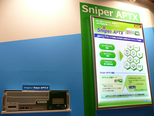 また、セキュアソフトでは、今回、標的型攻撃対策「SecureSoft Sniper APTX」を参考出展した。APT攻撃(特定の組織や個人を標的に、複数の攻撃手法を組み合わせ、執拗かつ継続的に攻撃を行う手法)を含む標的型攻撃への対策として、その根本となるマルウェア分析をサンドボックス技術とこれまでIPSで培ったパケット解析を合わせて実現するもので、来年度にリリース予定だ。