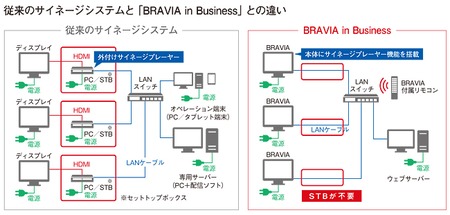 「カンタン」では、HTML5への対応、STB(セットトップボックス)などの外付け機器が不要な点が強み。HTML5対応によってウェブコンテンツがそのまま配信できるため、コンテンツ制作、メンテナンスの効率化を実現する。また、ブラビアに搭載したウェブブラウザに配信することで、STBを必要とせず、ネットワークにつなげばブラビア単体でサイネージとして活用できる。ウェブサーバーを活用したコンテンツの同時配信も可能。Web-Basedサイネージに最適と評価される理由だ。