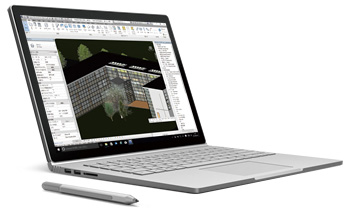 飯田 (画面をみせて)Revitのサンプルデータですが、このように快適に動いています。Surface Bookでは、この環境を持ち運べる所がいいですね。先ほども申しあげましたが、いままでのモバイルワークステーションは重くて、モバイルじゃないですよね。あまりにも大きくて置いて使う感じです。ようやくモバイルで活用できるPCが出てきたと思っています。
