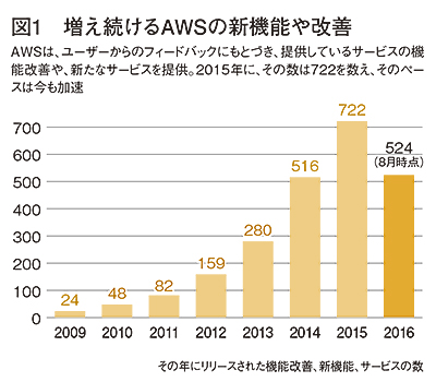 AWSはIoT以外の分野においても、ユーザーニーズを先取りするかたちで新たなサービスを次々と投入している(図1)。「AWSが投入するサービスは、常に顧客に向いている。新サービスや新機能の9割以上は、顧客から要望を聞いて内容を決めているからだ。今年は8月までに524の新機能をリリースした。昨年は722で過去最大だったが、今年もそれと同等かそれを上回るペース」と今野本部長はいう。その有効性は、実際にユーザーでもあるアマゾン・ドット・コムで証明済みだ。