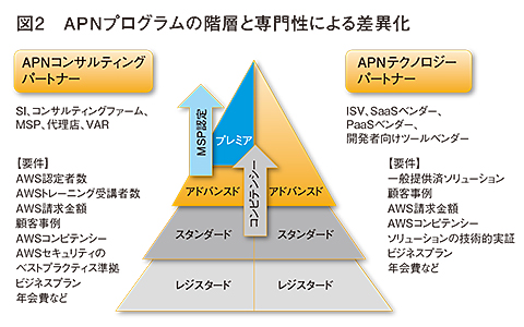 APNにはパートナーのレベルに応じた階層が用意されている。例えばAPNコンサルティングパートナーは「プレミア」「アドバンスド」「スタンダード」の3階層で構成され、階層に応じた特典やトレーニング、ファンド支援等のプログラムが用意されている(図2、図3)。ただし、階層ごとに求められる要件が設定されていて、それをクリアしなければ認定されない。