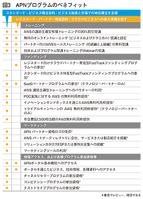 APNパートナーになるためには相応の時間がかかる。ビジネスプランの提出や複数の導入事例などが必要とされるからだ。そこでAWSは、ビジネスプラン策定のサポートやビジネス拡大に関するノウハウの紹介なども行っている。また、APNパートナーとなる準備段階として「レジスタード」というパートナーレベルを用意(図3)。レジスタードは、ウェブ登録だけで参加できる(
