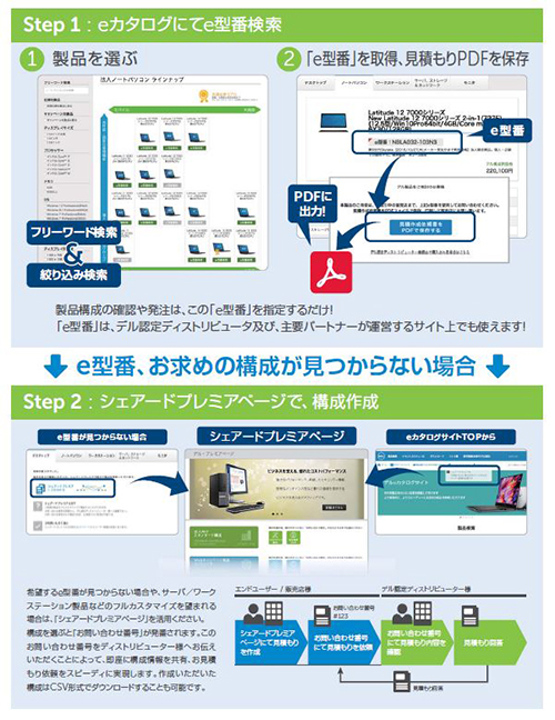 「Dell eカタログサイト」とは、デル製品を販売する販売パートナー向け、または購入したいユーザー企業向けに、デル製品の簡単見積もりと、製品情報を提供するためのサイトだ。共通の「e型番」で商談を進めることができ、リセラーが都度構成を組んで見積もりを取得する必要がなく、大幅な工数削減とビジネスの加速を見込むことができる。「e型番」とは、販売実績に基づいた厳選された構成にて固定されるデル製品の型番で、カスタマイズモデルによって、お得な価格設定となっている。そのため、e型番モデルはユーザー企業に提案しやすい売れ筋製品といっていいだろう。